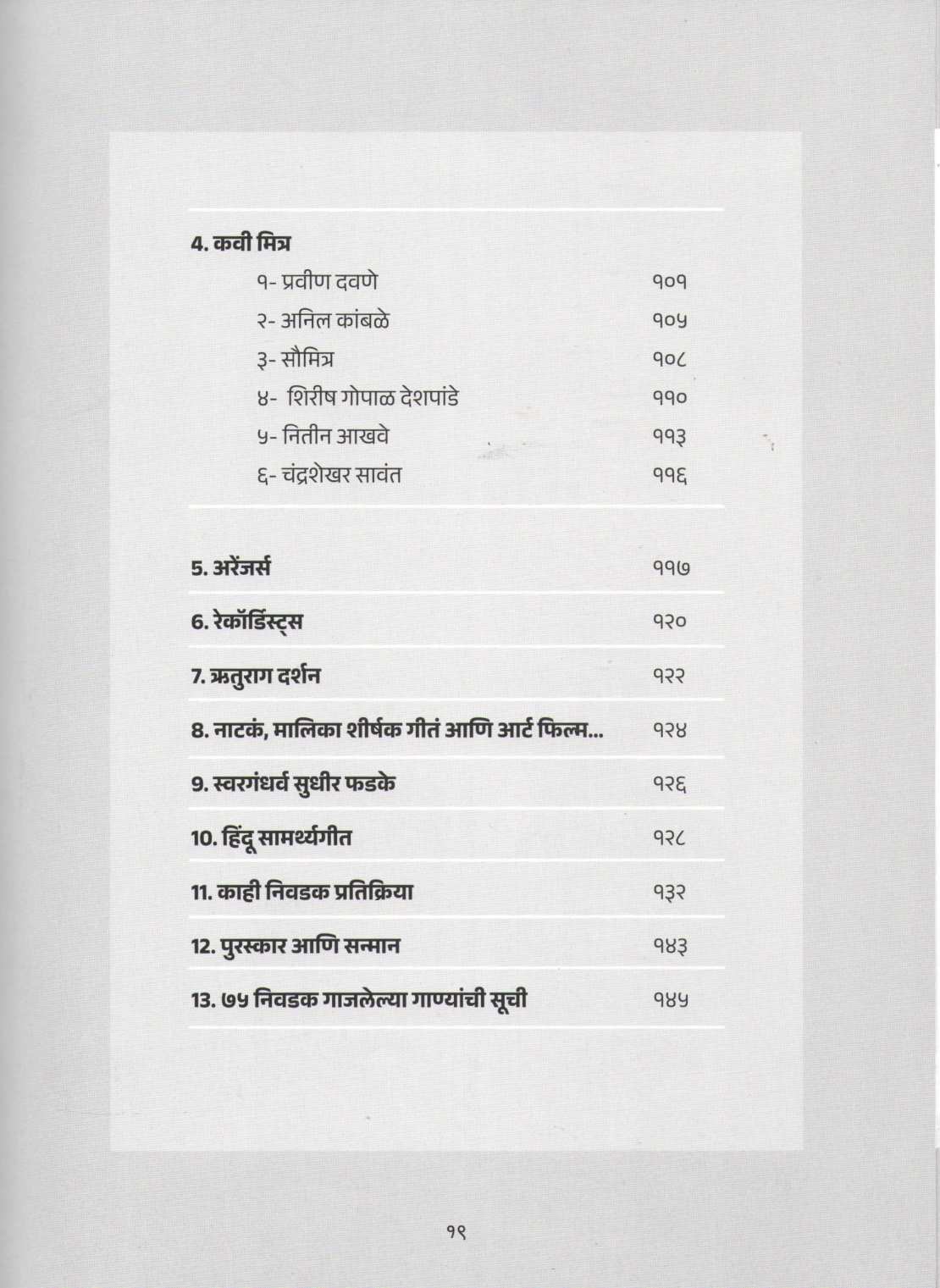 ज्येष्ठ संगीतकार गायक श्री. श्रीधर फडके यांच्या ५० वर्षांच्या सांगीतिक कारकिर्दीचा आढावा घेणारं हे पुस्तक आहे. आई- वडिलांकडून मिळालेल्या उत्तम संस्कारांची शिदोरी घेऊन, श्रीधरजींनी स्वतःची स्वतंत्र आणि देखणी संगीत-वाट निर्माण केली. ‘संगीत मनमोही रे’ हे रसिकमनाला प्रत्येक कलाकृतीतून सुकन्या जोशी त्यांनी पटवून दिलं आहे. ‘गाणार, वाजविणार तैसेचि ऐकणार’ यावत् त्यांचं संगीत प्रत्येकाला मोहित करतं. श्रीधरजींची संगीताप्रती असलेली निष्ठा, आणि आजपर्यंत त्यांनी जोडलेली माणसं याचं दर्शन या पुस्तकाच्या प्रत्येक प्रकरणातून होत राहतं. या पुस्तकात त्यांचं कुठलंही गाणं नेमकं कसं ऐकायला हवं, याची दृष्टी ते आपल्याला देतात. कवीच्या शब्दांवर नितांत प्रेम करणारा हा संगीतकार आहे. कवितांचा भरपूर अभ्यास. त्या शब्दांचा स्वरांशी मेळ घालताना, शब्दांवर कुठेही कुरघोडी न करता, त्या काव्याच्या अर्थाला, भावनेला श्रीधरजी चाल लावतात. चालीवर शब्द लिहून घेतानाही, कुठेही शब्दांची ओढाताण होताना दिसत नाही. म्हणूनच त्यांचं कुठलंही गाणं ‘लय ललित ही रागिणी ‘असंच भासतं. जर एखाद्या अभ्यासकाला श्रीधरजींच्या गाण्यांचा अभ्यास करायचा असेल, किंवा त्यांच्या गाण्यांवर संशोधन करायचं असेल, तर हे पुस्तक त्यांच्यासाठी एक आदर्श ठरेल, असा विश्वास वाटतो. पुस्तक वाचताना ‘अमृताच्या जणू ओंजळी’ आहेत याचा अनुभव वाचकांना निश्चित मिळेल. त्यांच्या गाण्यांचा कॅनव्हास हिरव्या ऋतूसारखा कायम टवटवीत राहो, हीच ईश्वरचरणी मनोभावे प्रार्थना.