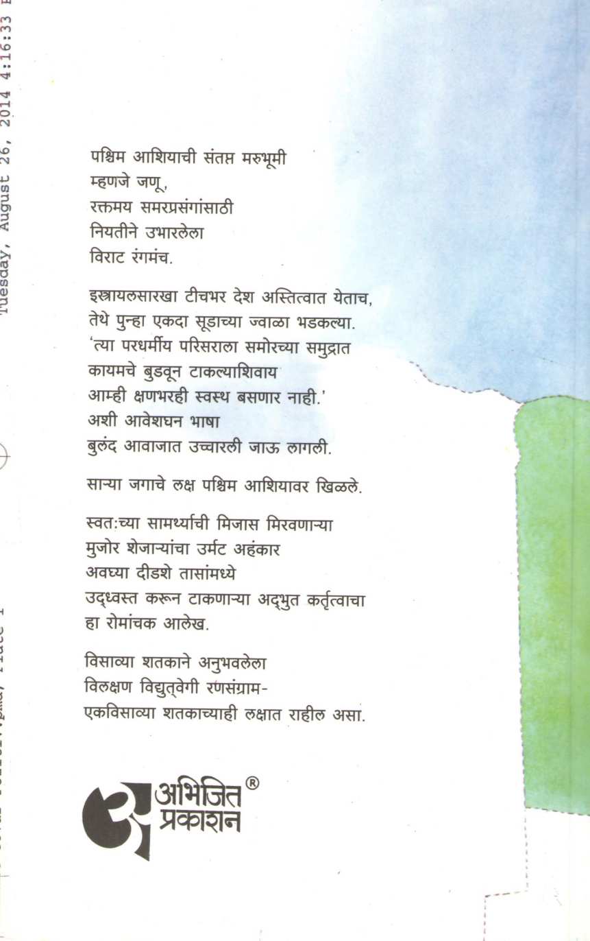 पश्चिम आशियाची संतप्त मुरूभूमी म्हणजे जणू रक्तमय समर प्रसंगासाठी नियतीने उभारलेला विराट रंगमंच. इस्त्रायल सारखा टीचभर देश अस्तित्वात येताच तेथे पुन्हा एकदा सूडाच्या ज्वाळा भडकल्या. साऱ्या जगाचे लक्ष पश्चिम आशियावर खिळले. स्वतःच्या सामर्थ्याची मिजास मिरवणाऱ्या मुजोर शेजाऱ्यांचा उर्मट अहंकार अवघ्या दीडशे तासांमध्ये उद्ध्वस्त करून टाकणाऱ्या इस्त्रायलच्या अद्भुत कर्तृत्वाचा हा रोमांचक आलेख. विसाव्या शतकाने अनुभवलेल्या विलक्षण विद्युत वेगी रणसंग्राम.