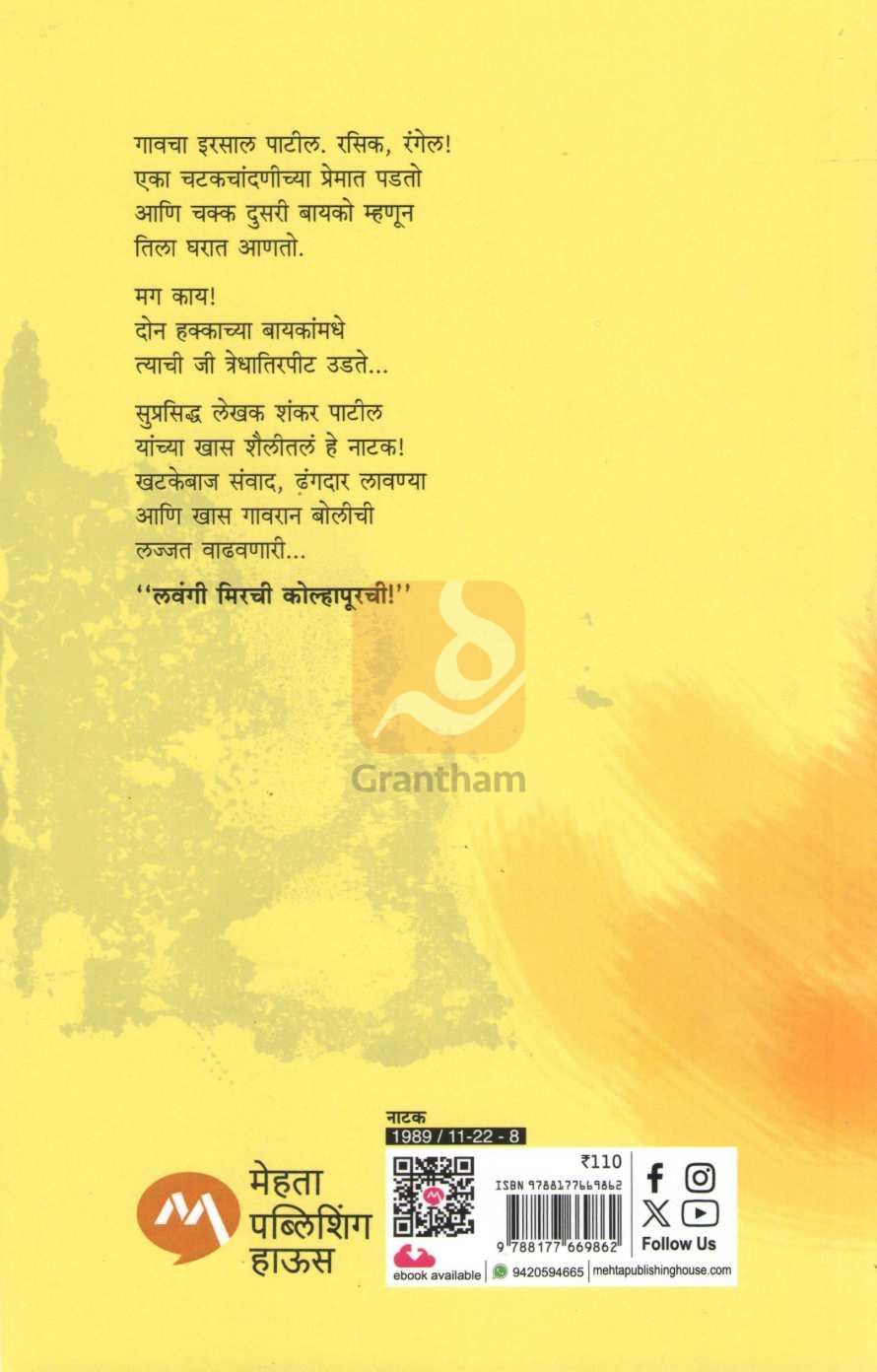 गावचा इरसाल पाटील. रसिक, रंगेल ! एका चटकचांदणीच्या प्रेमात पडतो आणि चक्क दुसरी बायको म्हगणून तिला घरात आणतो. मग काय ! दोन हक्काच्या बायकांमध्ये त्याची जी त्रेधातिरपीट उडते... सुप्रसिद्ध लेखक शंकर पाटील यांच्या खास शैलीतलं हे नाटक ! "खटकेबाज संवाद ढंगदार लावण्या आणि खास गावरान बोलीची लज्जत वाढवणारी... " लवंगी मिरची कोल्हापूरची